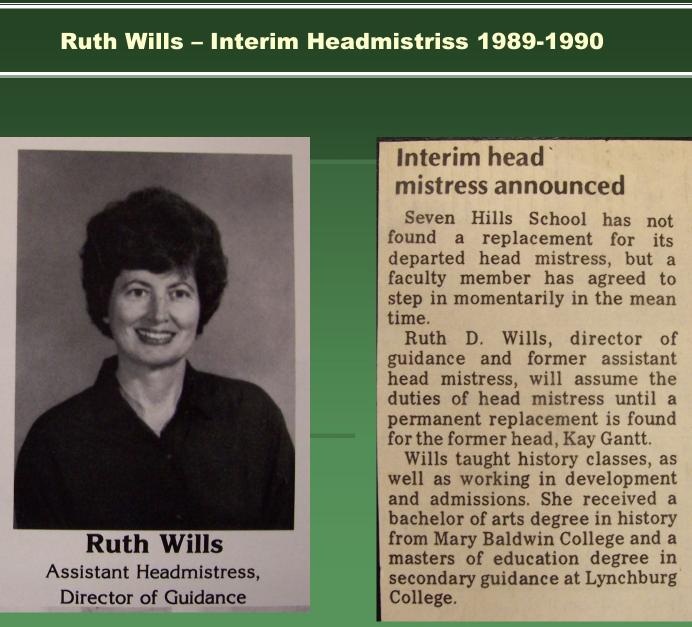 Following Kay Gantt’s departure, Ruth Wills, a former teacher who was serving as assistant headmistress,