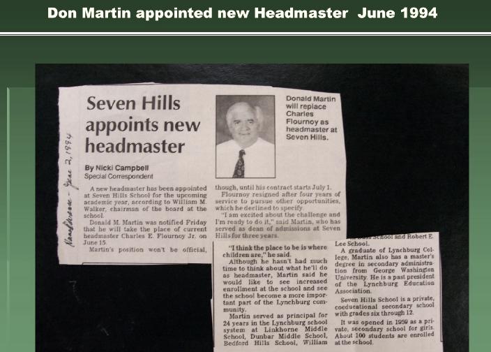Don Martin, a former administrator in the Lynchburg City School system, was named headmaster in 1994. In 1994, the class of 1974 had an impromptu “reunion” at the school and Mr. Martin addressed our group. In his remarks he was very candid about the financial difficulties the school had been facing: Enrollment was down, donations had fallen off, and the school was finding it difficult to keep up with costly repairs to the facility as well as pay the salaries needed to attract and retain good teachers. Mr. Martin said he voluntarily had not drawn a salary to help with the cash flow situation. This reunion was a bittersweet get together – we were happy to see each other but disheartened by the deteriorating facilities and the financial problems that seemed insurmountable. | ||