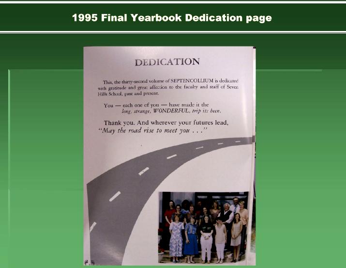 The dedication of the 1995 – the final – yearbook was fitting, especially with the words of the song which I believe we felt was the official school song ... "May the road rise to meet you..." and The Grateful Dead: "What a long, strange WONDERFUL trip it’s been | ||